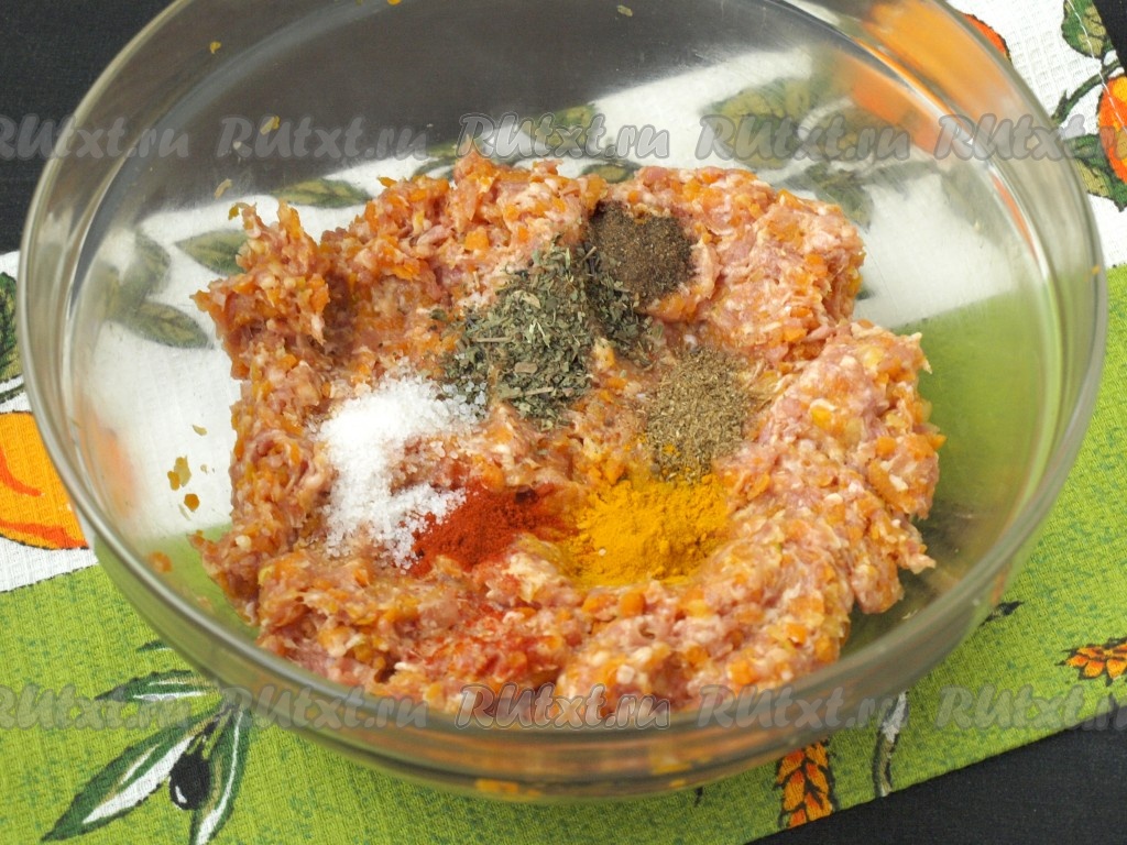 Тщательно перемешать фарш и тыкву, добавить все необходимые специи. На мой вкус, те специи, которые я указала, очень хорошо дополнили друг друга, но вы можете добавить что-то своё. Соли можно добавить больше, просто в моей семье солёная еда не приветствуется.