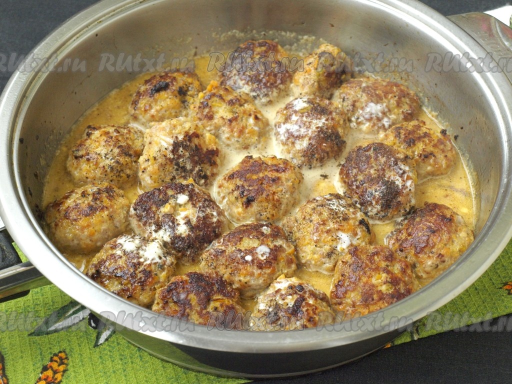 Затем все обжаренные котлеты залить соусом. Для приготовления соуса смешать сметану с водой, добавить немного соли. Сковороду с котлетами из индейки с тыквой накрыть крышкой и готовить на небольшом огне 10-15 минут. Таким образом у нас получится подлива, которой можно будет полить любой гарнир.