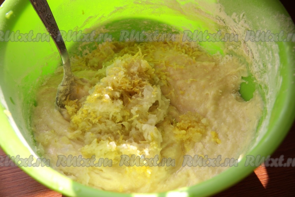 1 яблоко, очистив от кожуры и семечек, натереть на мелкой тёрке и вместе с выделившимся в процессе натирания соком добавить в тесто. Сюда же добавить цедру лимона и разрыхлитель.