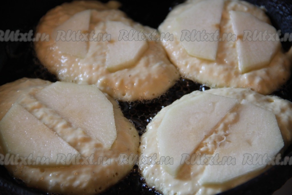 На разогретую сковороду влить немного растительного масла, раскалить. Затем выкладывать столовой ложкой тесто на сковороду в виде оладий. На один оладушек нам понадобится 1 столовая ложка теста. 1 яблоко, очистив от кожуры и семечек, нарезать на тонкие ломтикам и выложить сверху на тесто.