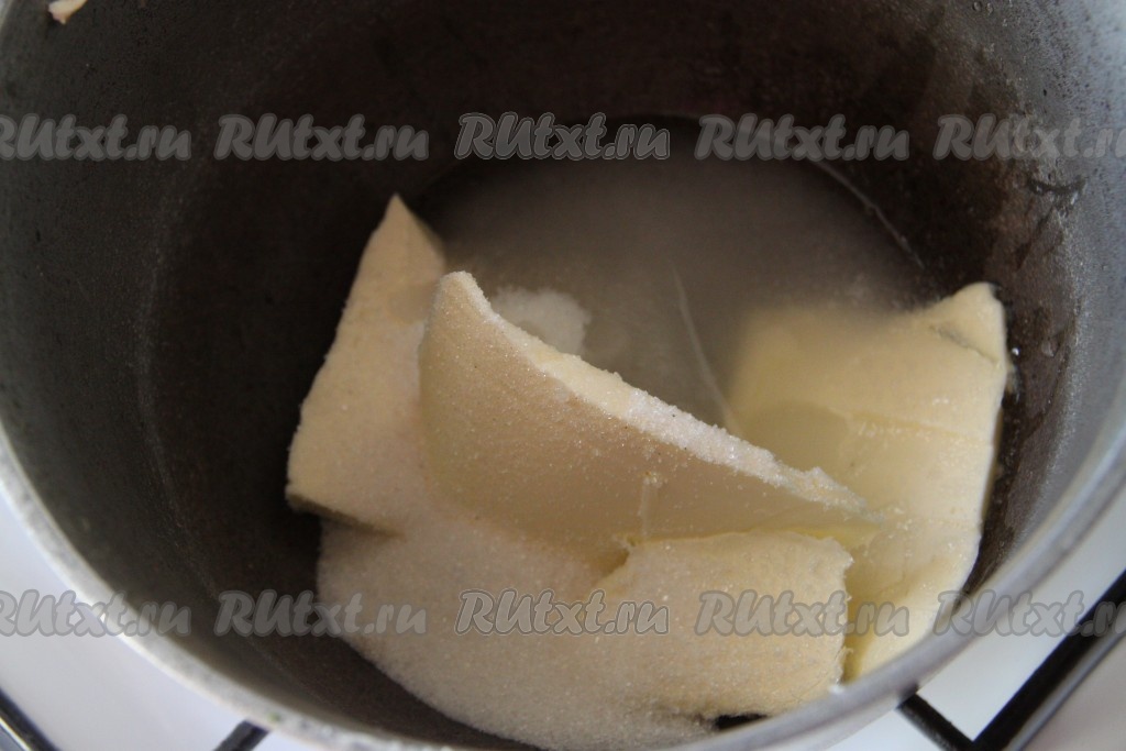 Сливочное масло нужно достать из холодильника заранее, чтобы оно согрелось до комнатной температуры и стало мягким. Для приготовления теста в казане (или толстостенной кастрюле) смешиваем сахар и сливочное масло комнатной температуры. Ставим на медленный огонь и растапливаем, помешивая.