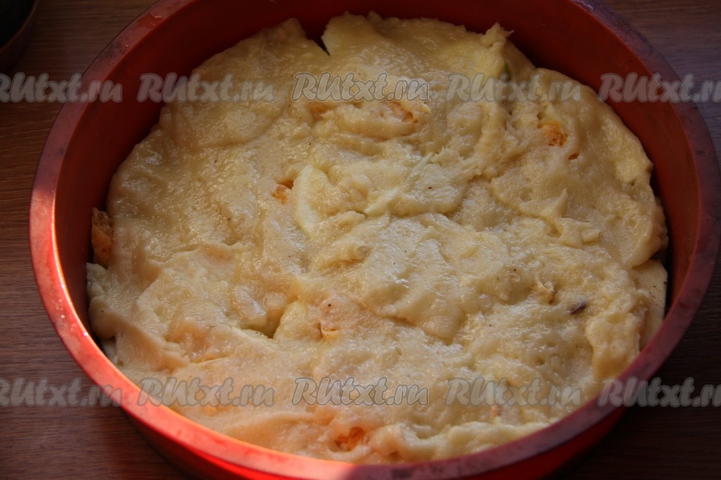 Получившееся заварное тесто равномерно намазываем на фрукты, если вам тяжело сделать это лопаткой, можете распределить его влажными руками.