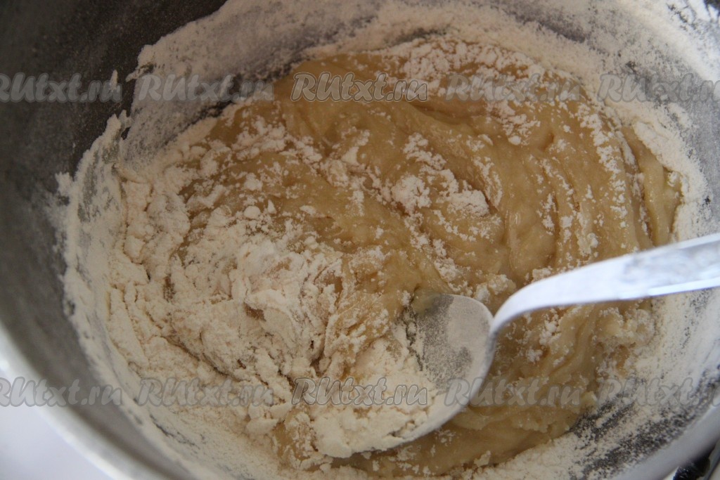 В масло, растопленное с сахаром, постепенно добавляем сметану, ванилин, цедру лимона и муку, тщательно перемешивая массу. Как только заварное тесто станет однородным, снимаем с огня. Тесто для этого яблочного пирога получится достаточно густым, похожим на заварное тесто для эклеров.