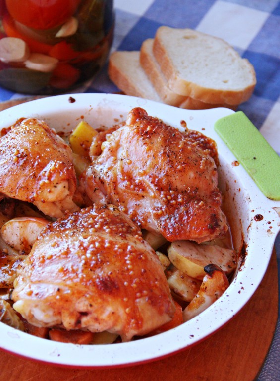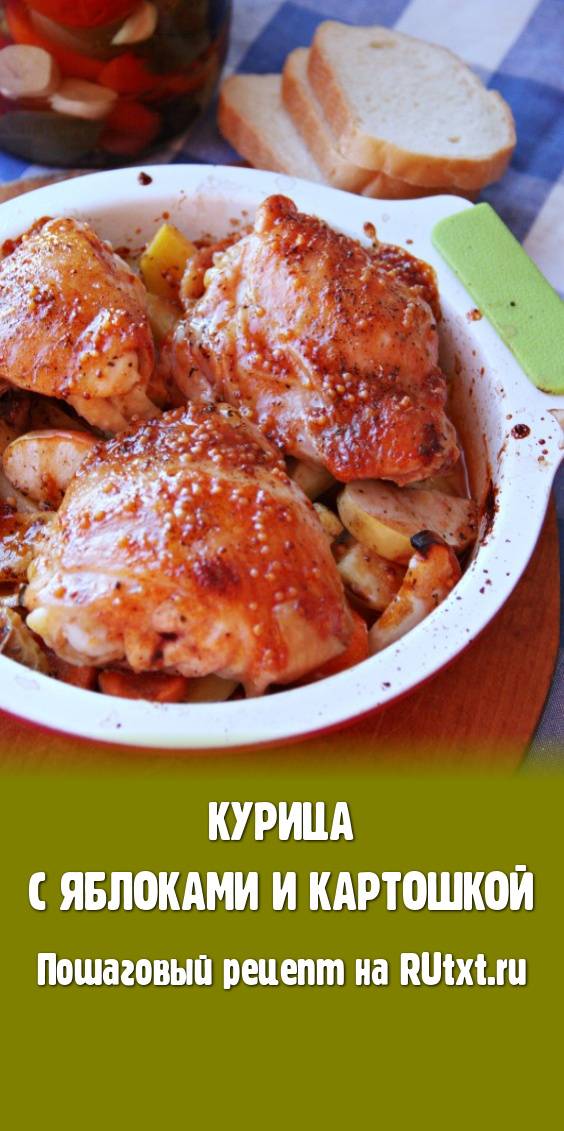 Снова отправить в духовку и запекать еще минут 15 (до румяной корочки). Курица получается аппетитной, ароматной и очень вкусной, а запеченные с ней картошка и яблоки станут отличным гарниром.