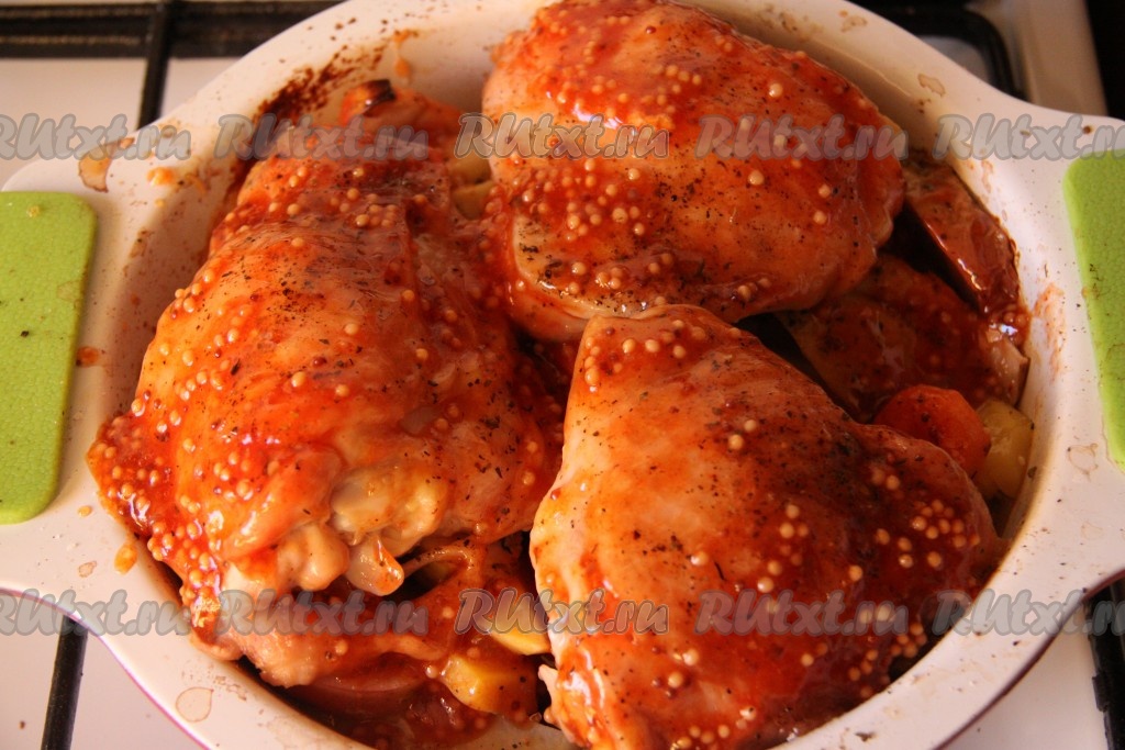 Достать курочку из духовки и полить приготовленной заливкой мясо и овощи.