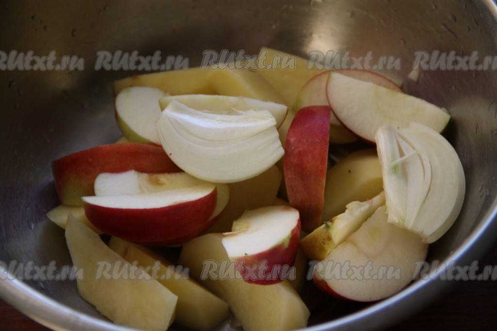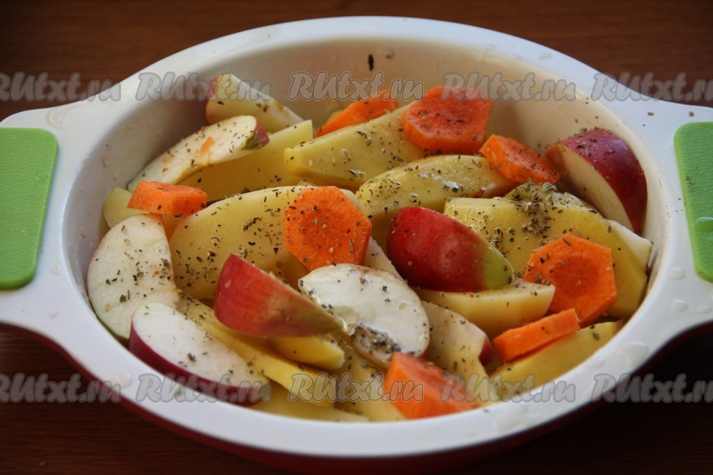 Картошку, лук и морковь очистить. Картофель, лук, морковь и яблоки нарезать ломтиками, слегка посолить и поперчить.