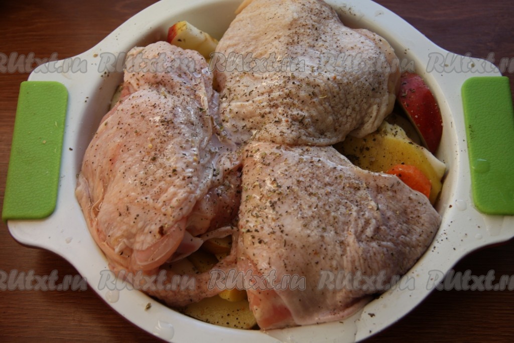 Курицу, нарезав на порционные кусочки, посолить, поперчить и выложить на овощи и яблоки, полить растительным маслом и отправить в духовку, разогретую до 180 градусов, минут на 40. Запекать до готовности мяса и картошки.