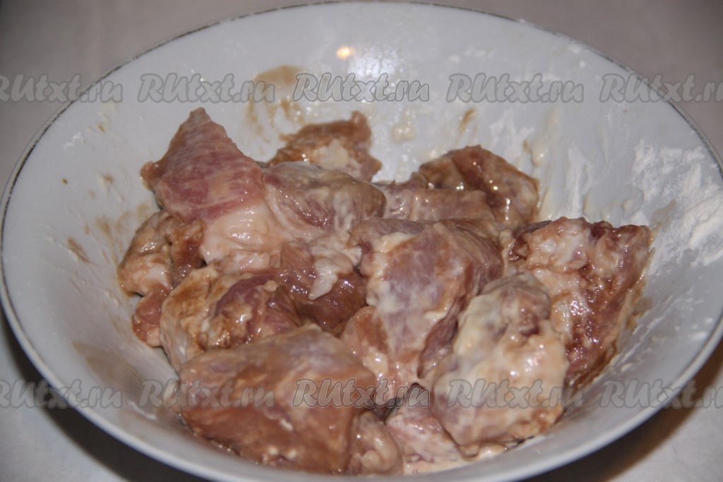 Свинину нарезать на квадратики со стороной 3 сантиметра. Посолить по вкусу. Добавить к мясу муку, перемешать.