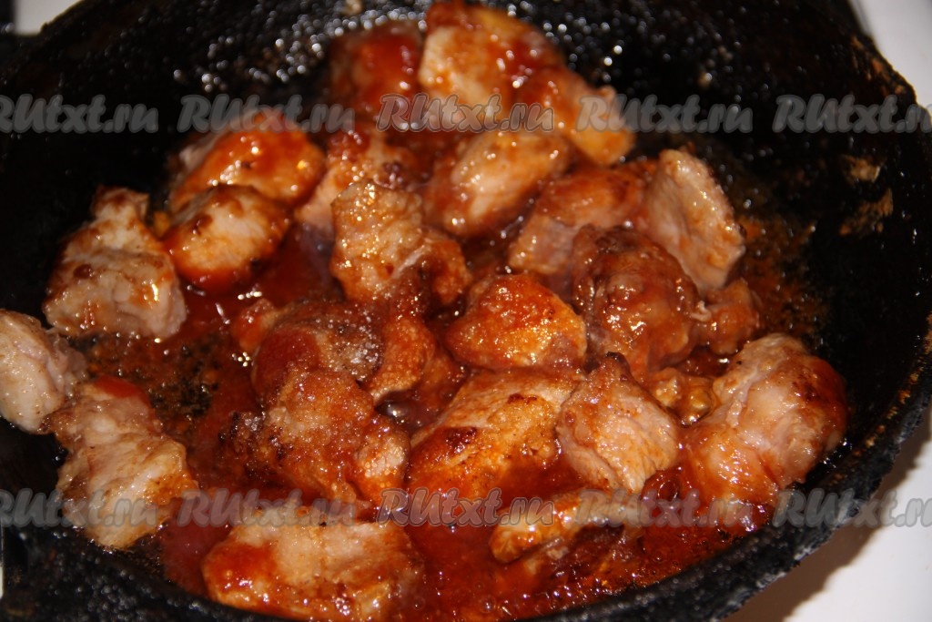 Смешать кетчуп с обжаренными кусочками мяса, влить немного воды, чтобы она покрывала дно сковородки. Накрыть сковороду крышкой и тушить свинину на минимальном огне до мягкости мяса (минут 30-35). В процессе тушения, если вода будет выкипать, добавьте ещё совсем немного воды.
