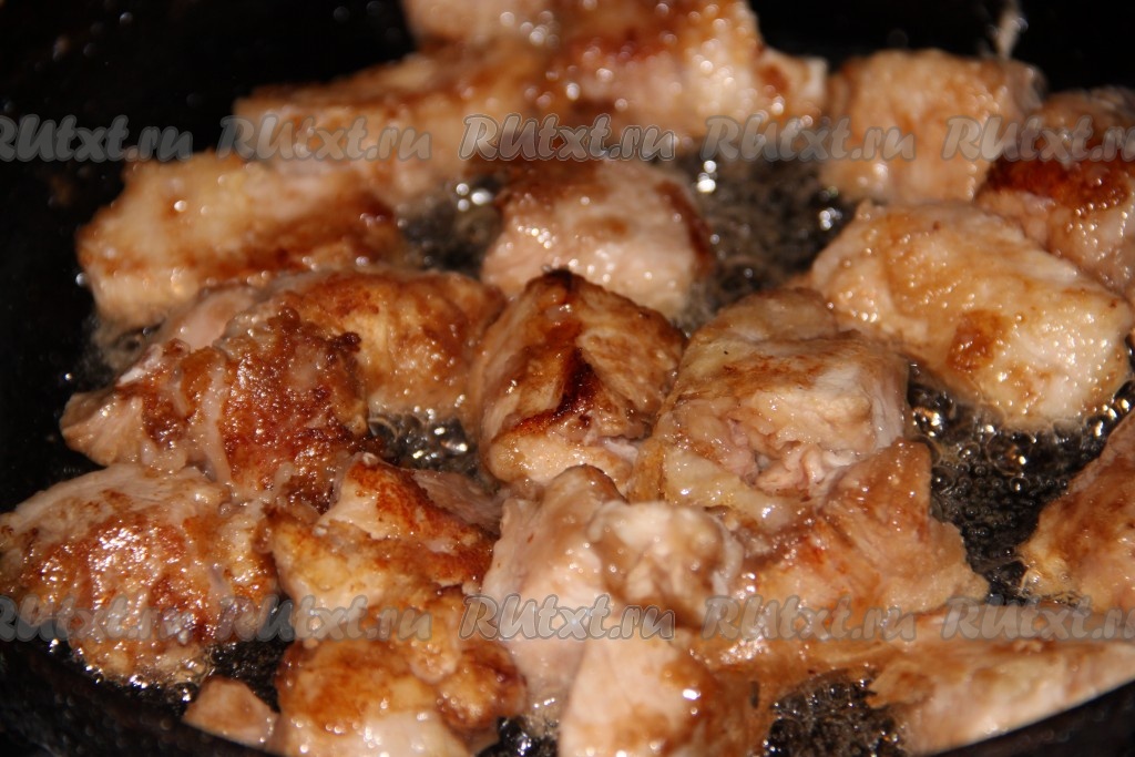 На сковороде разогреть растительное масло, выложить свинину и обжарить с двух сторон на огне выше среднего, переворачивая всего один раз. Мясо должно покрыться аппетитной румяной корочкой.