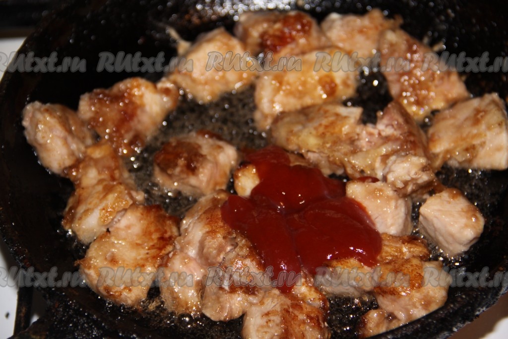 Когда свинина будет обжарена, влить в сковороду кетчуп.