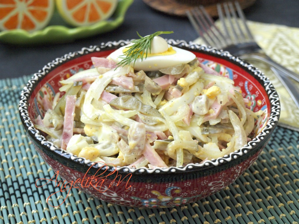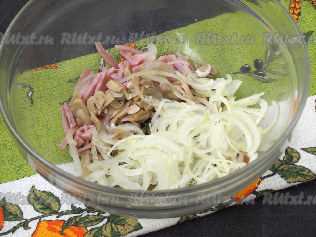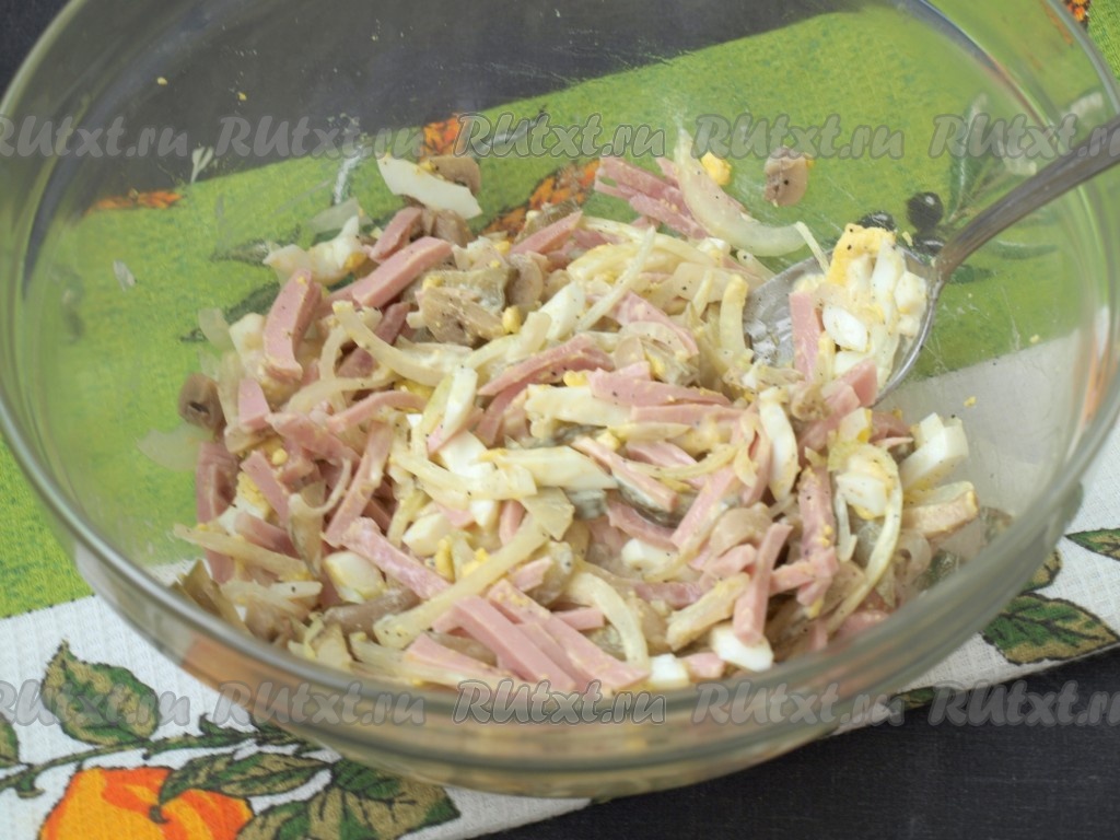 Пластинками нарезать маринованные грибы, добавить их вместе с луком в салат из ветчины и маринованных огурцов.