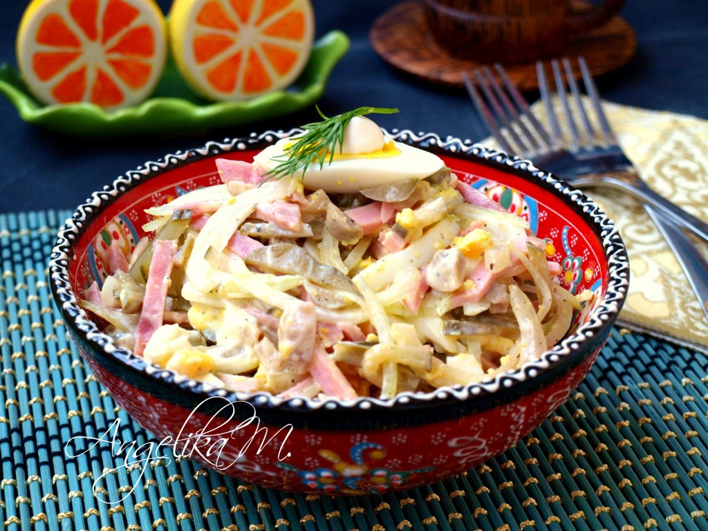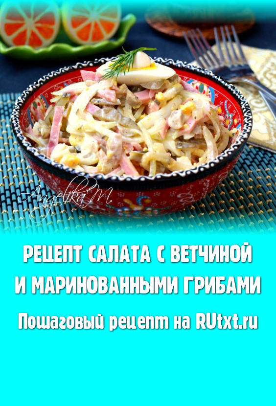 Салат с ветчиной и маринованными грибами - очень вкусное, простое блюдо, которым можно разнообразить домашнее меню. Конечно, никто не говорит, что салат, приготовленный по этому рецепту, нельзя подать к праздничному столу. Если его подать в красивом салатнике и украсить, то этот салатик привлечёт внимание и, уверена, очень понравится гостям.