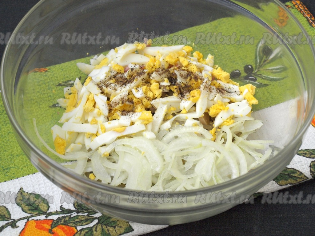Соломкой нарезать варёные яйца, добавить в салат, посолить и поперчить.