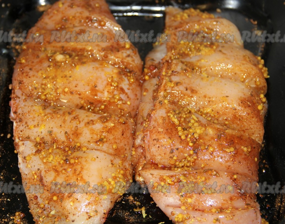 Разделить куриные грудки на 4 филе. На каждом кусочке сделать 5-6 надрезов. Положить мясо в глубокую форму, добавить соевый соус, цедру лимона, приправы, горчицу (не солить, так как соевый соус - соленый). Замариновать и оставить на 30 минут.