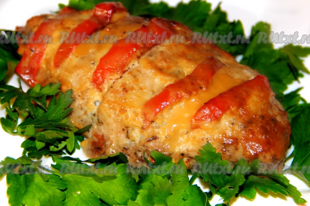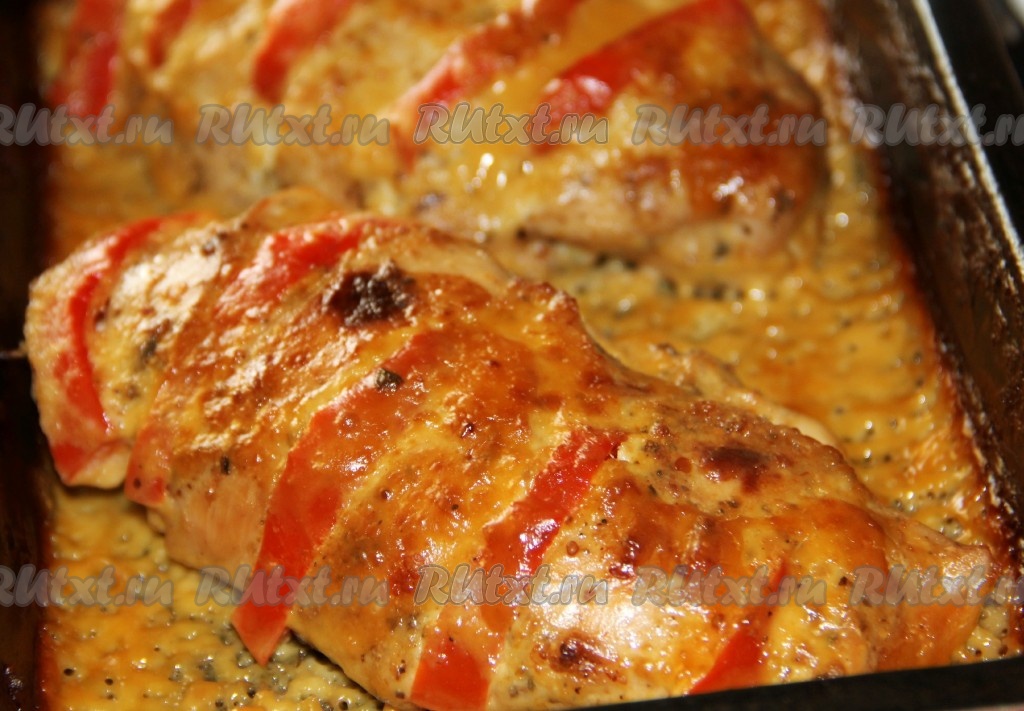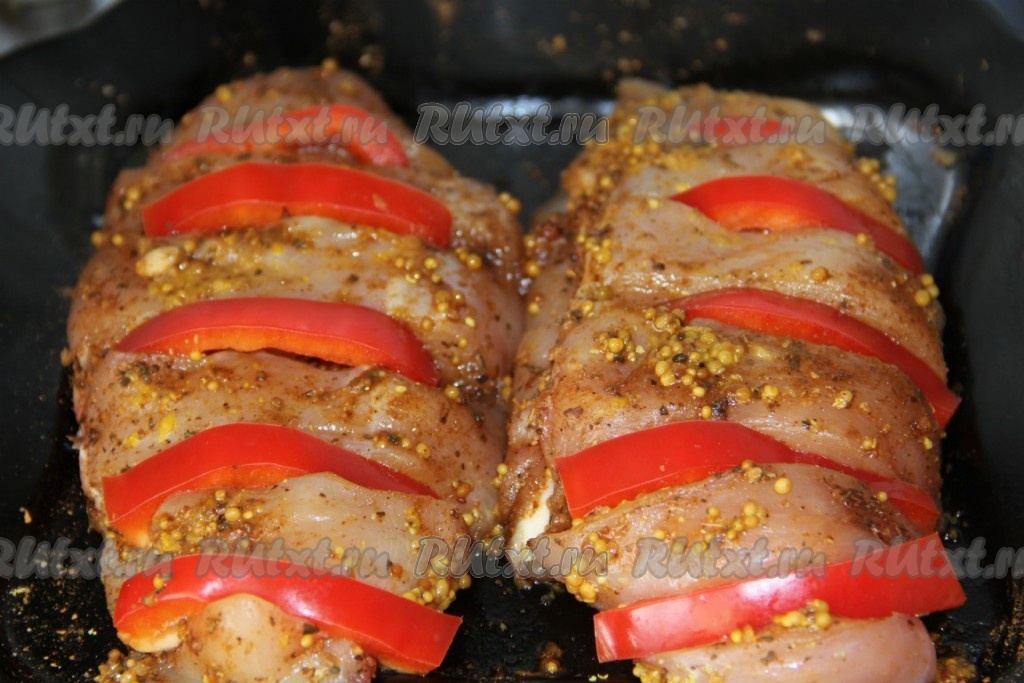 В разрезы куриной грудки вставляем полоски перца.