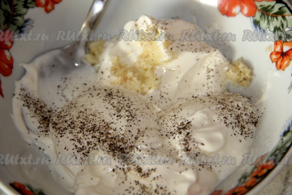 Чеснок почистить и пропустить через чеснокодавилку. Добавить сметану, черный перец, немного посолить.