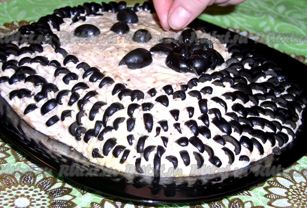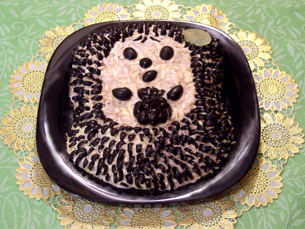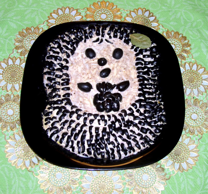 Верхний слой салата также смазать чесночно-ореховой заправкой и загладить поверхность широким ножом или лопаткой. Маслины нарезать тонкими, длинными полосками в форме колючек и выложить на салат. Из маслин вырезать глазки, носик "ежика" и оформить ими мордочку "ежика".