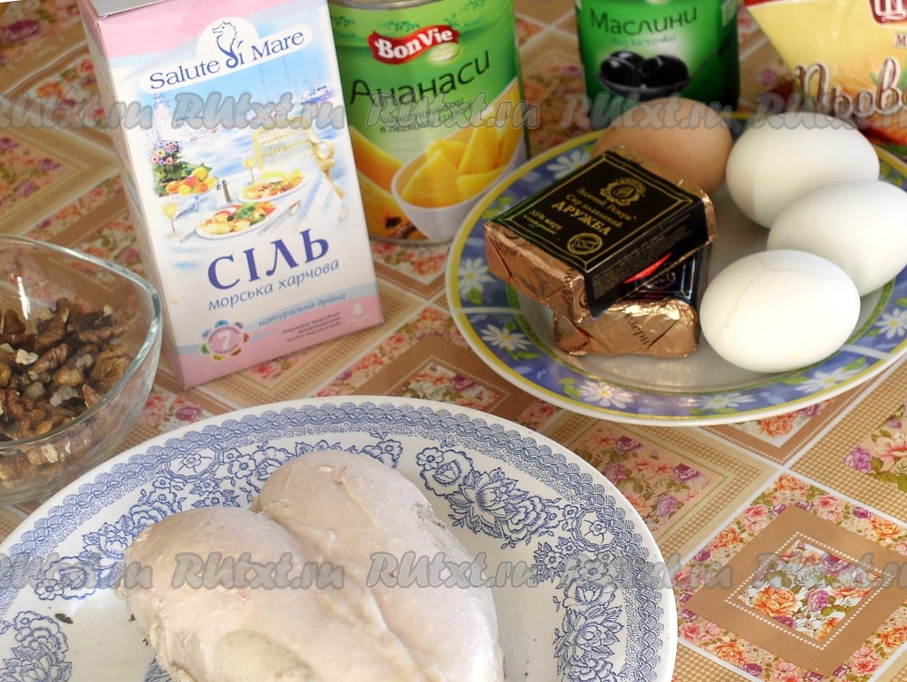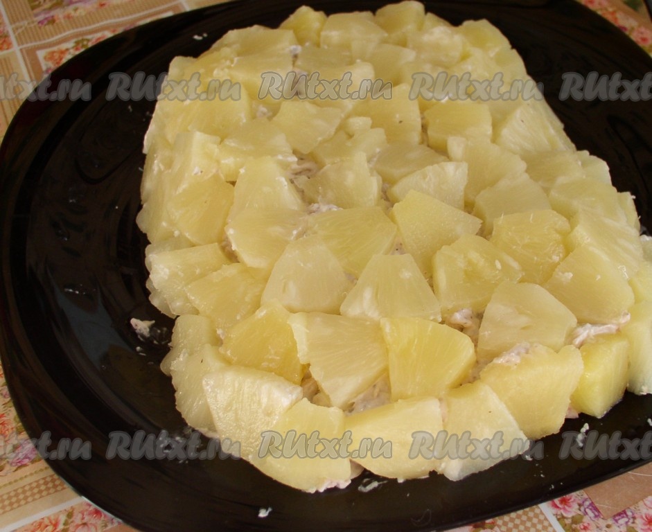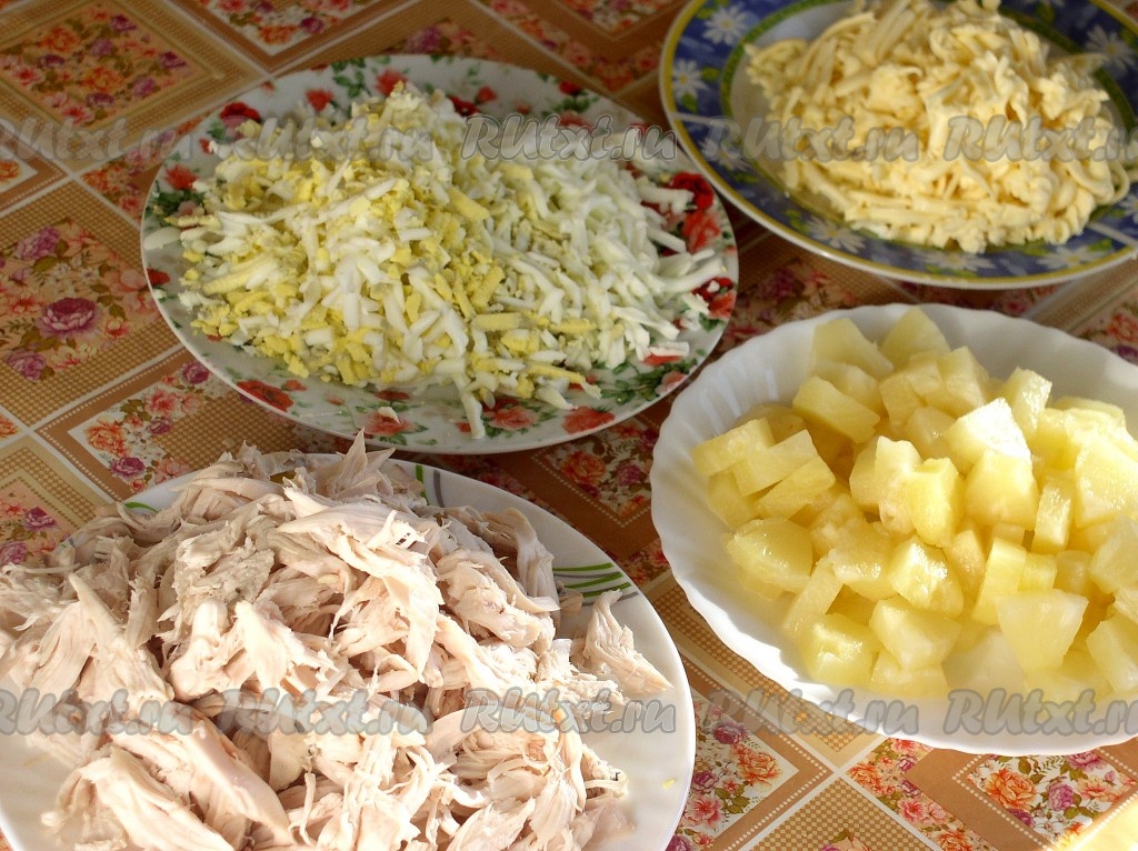 Консервированные ананасы нарезать меленько в отдельную мисочку, слить выделившийся сок. Филе меленько порвать на волокна. Вареные яйца и сыр натереть по отдельности на крупной тёрке. На мой вкус, салат нежнее с плавленным сыром. Из твердых сыров, мне кажется, в этом салате вкуснее жирные мягкие сорта сыра. Выбирайте сыр на свой вкус.