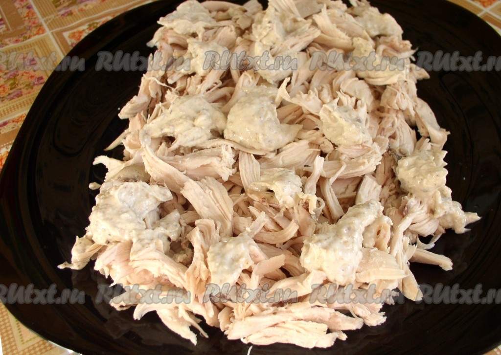 Куриное филе отварить в подсоленной воде до готовности и остудить. Для приготовления заправки блендером измельчить грецкие орехи в мелкую крошку. Добавить к измельченным орехам пропущенный через пресс чеснок, растереть, затем добавить майонез и тщательно перемешать получившуюся заправку до однородности.