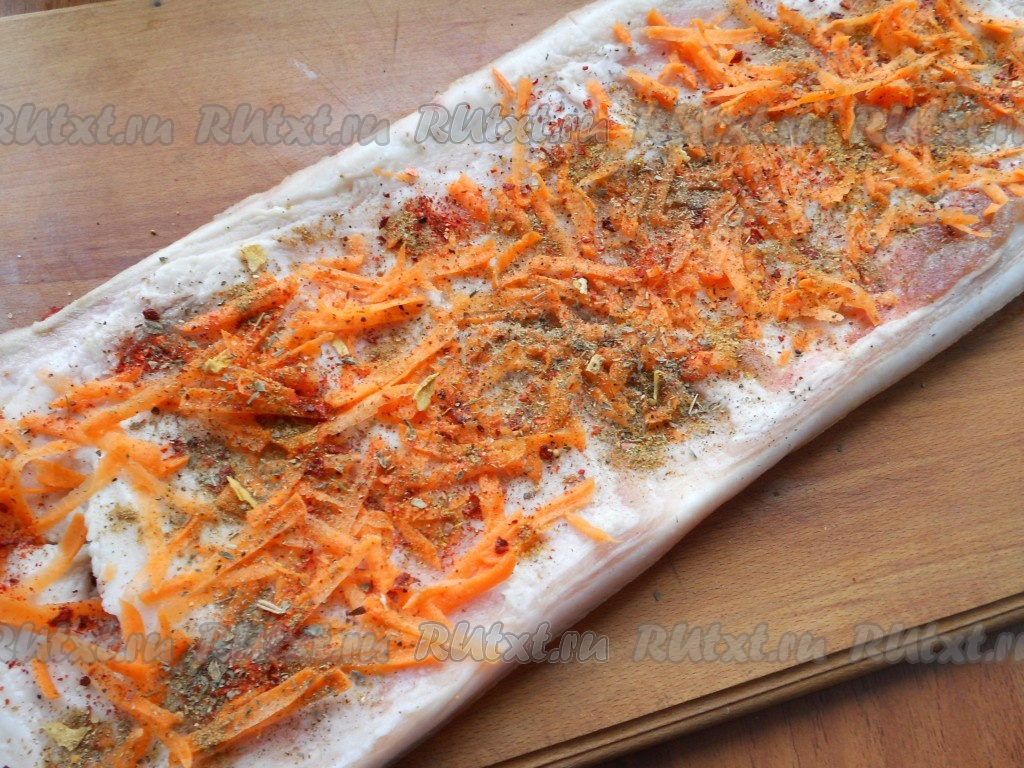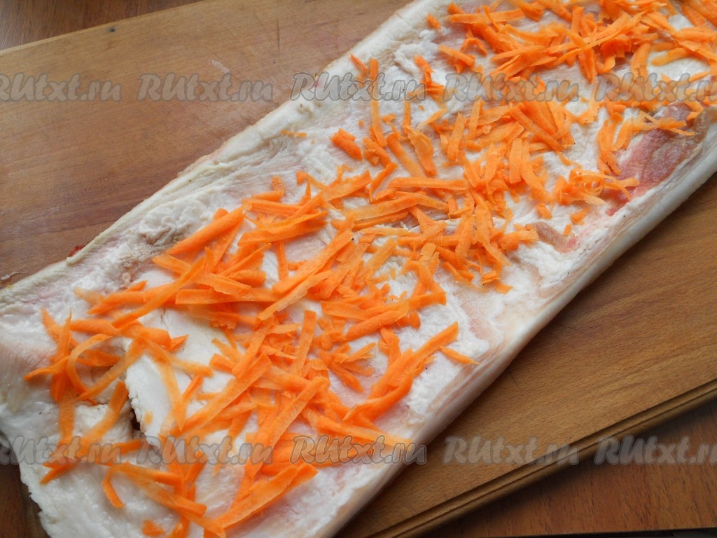 Пласт сала хорошо вымыть, поскрести шкуру, обсушить бумажными полотенцами. Разложить сало шкурой вниз. Морковь, натерев на крупной терке, выложить на сало.