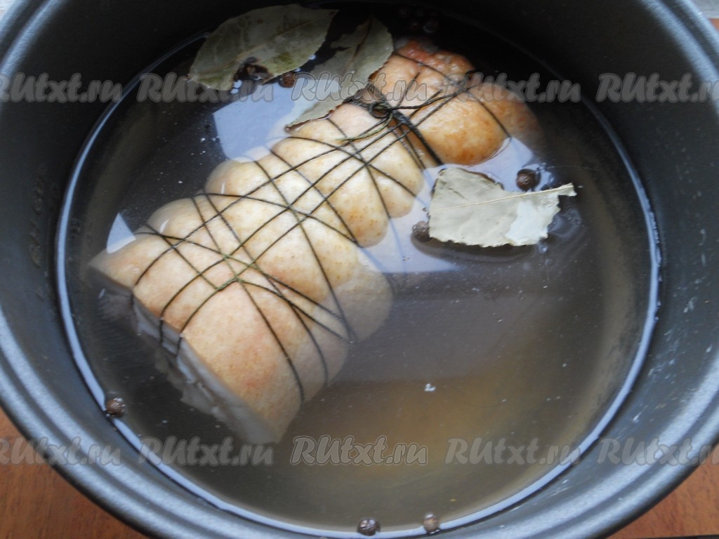 Поместить рулет в кастрюлю, залить водой (вода должна полностью покрыть рулет), всыпать 1 чайную ложку соли, добавить лавровые листья и душистый перец. Варить свиное сало при слабом кипении около 1,5 часов. Я варила рулет в мультиварке, выставив режим "Холодец" на 2 часа.