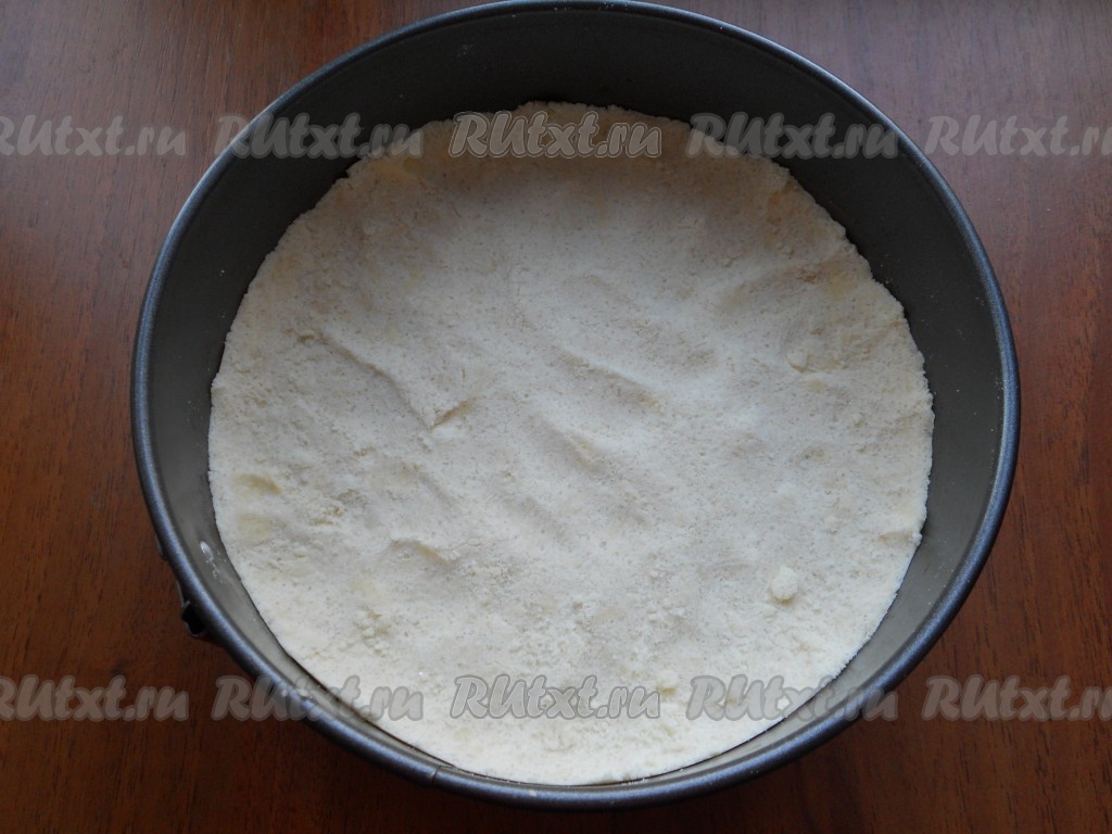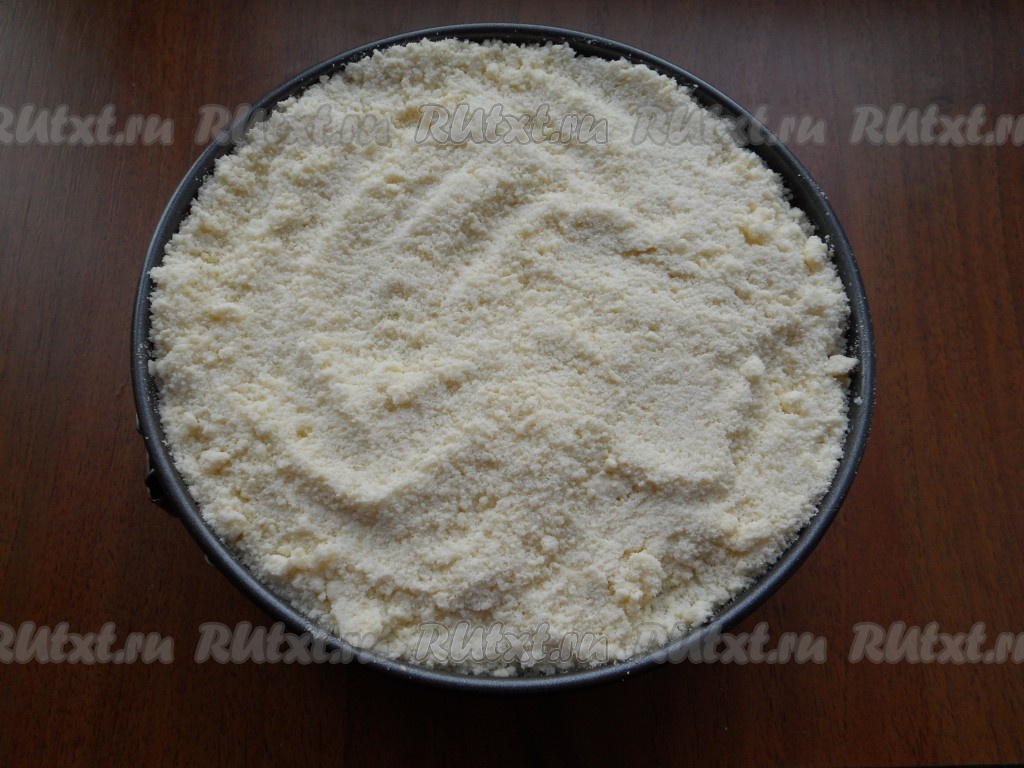 Дно разъёмной формы для выпечки диаметром 18-20 сантиметров застелить пергаментом. Выложить 2/3 получившейся крошки в подготовленную форму для выпечки, хорошо утрамбовать. Поместить форму с тестом-крошкой в холодильник на время, пока готовим начинку (ориентировочно минут на 30). Миску с оставшейся крошкой тоже поставить в холодильник.