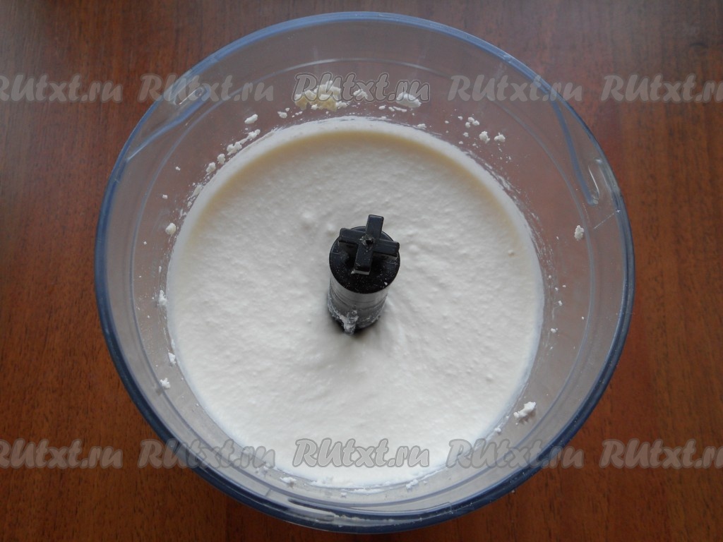 Взбить творог с яйцом до однородного состояния. При желании можно пробить творог с яйцом до однородности и с помощью погружного блендера.