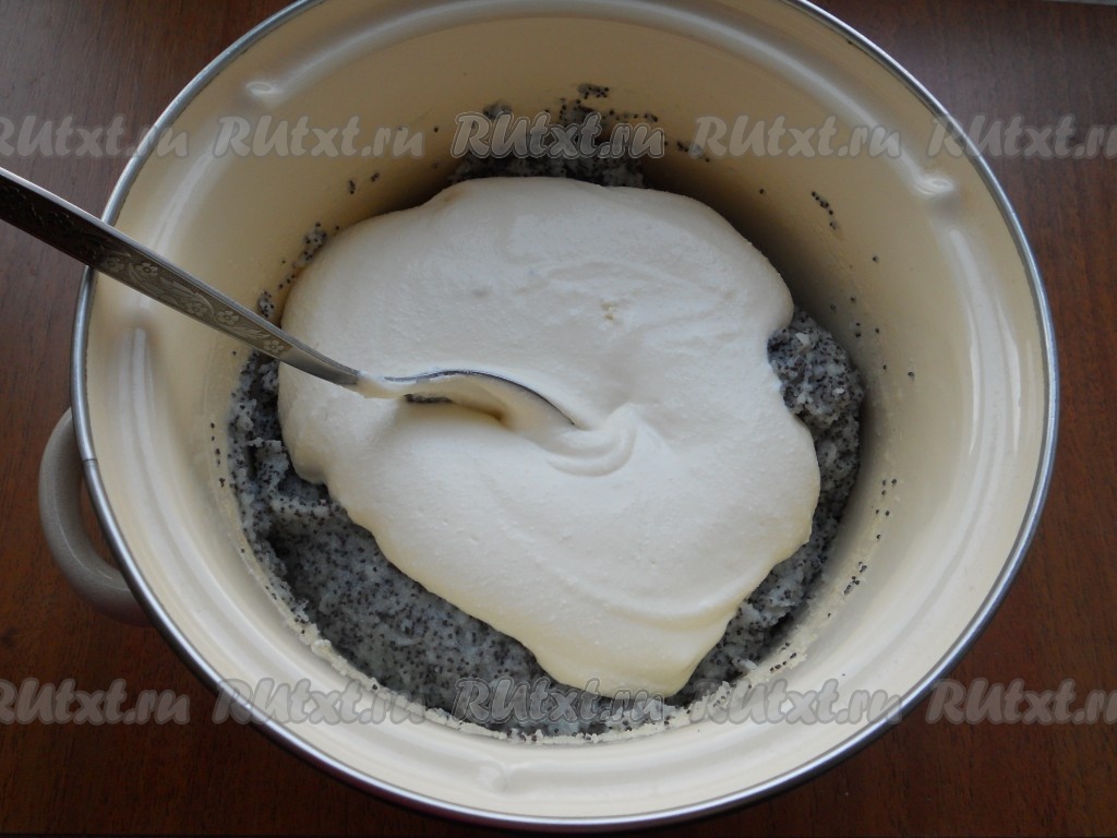 Творожную смесь добавить в тёплую манно-маковую массу, тщательно перемешать творожно-маковую массу (до однородности).
