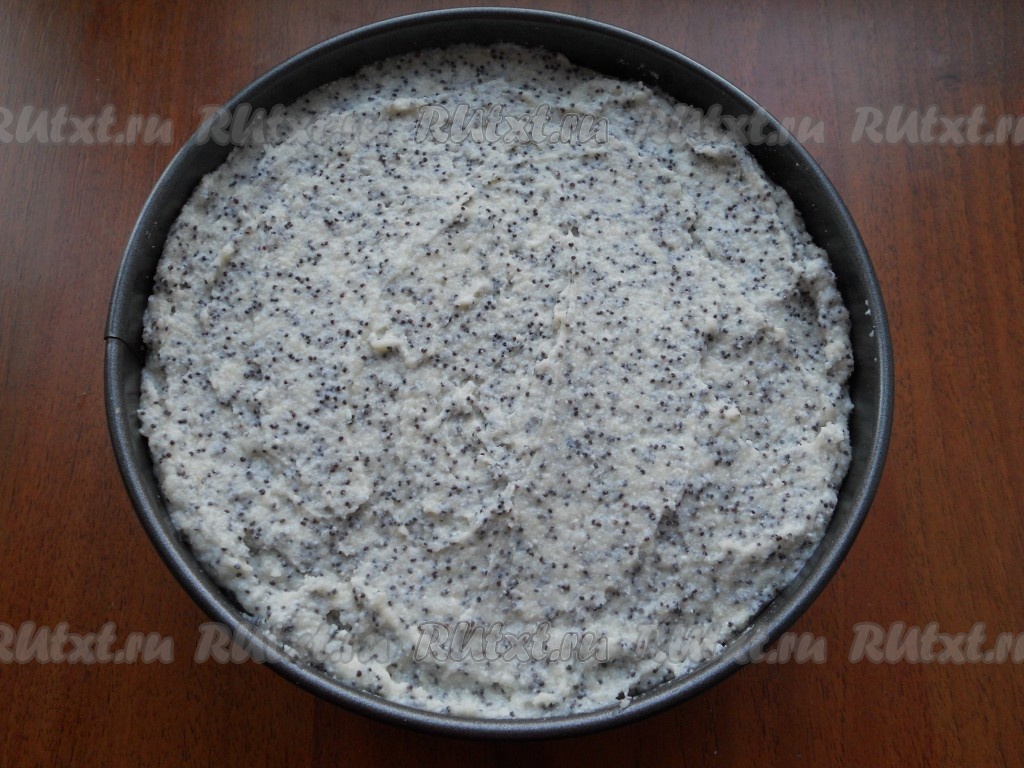 Достать форму с тестом-крошкой из холодильника. Поверх холодного теста-крошки равномерно выложить творожно-маковую массу.