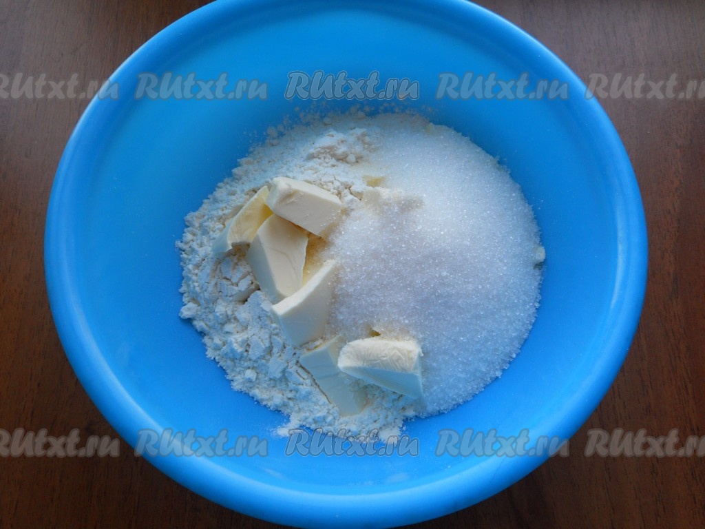 Прежде всего замесим песочное тесто-крошку, для этого в глубокую миску нужно всыпать просеянную муку, добавить холодное сливочное масло, нарезанное на кусочки, всыпать сахар.