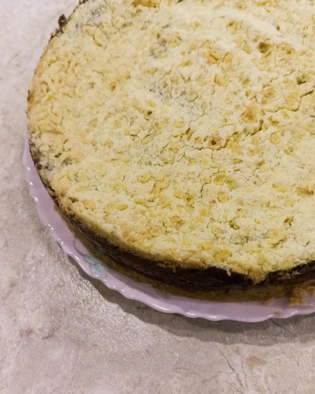 Сверху засыпать оставшейся крошкой-тестом, разровнять. Выпекать королевскую ватрушку с творогом и маком в предварительно разогретой до 180 градусов духовке 1 час.