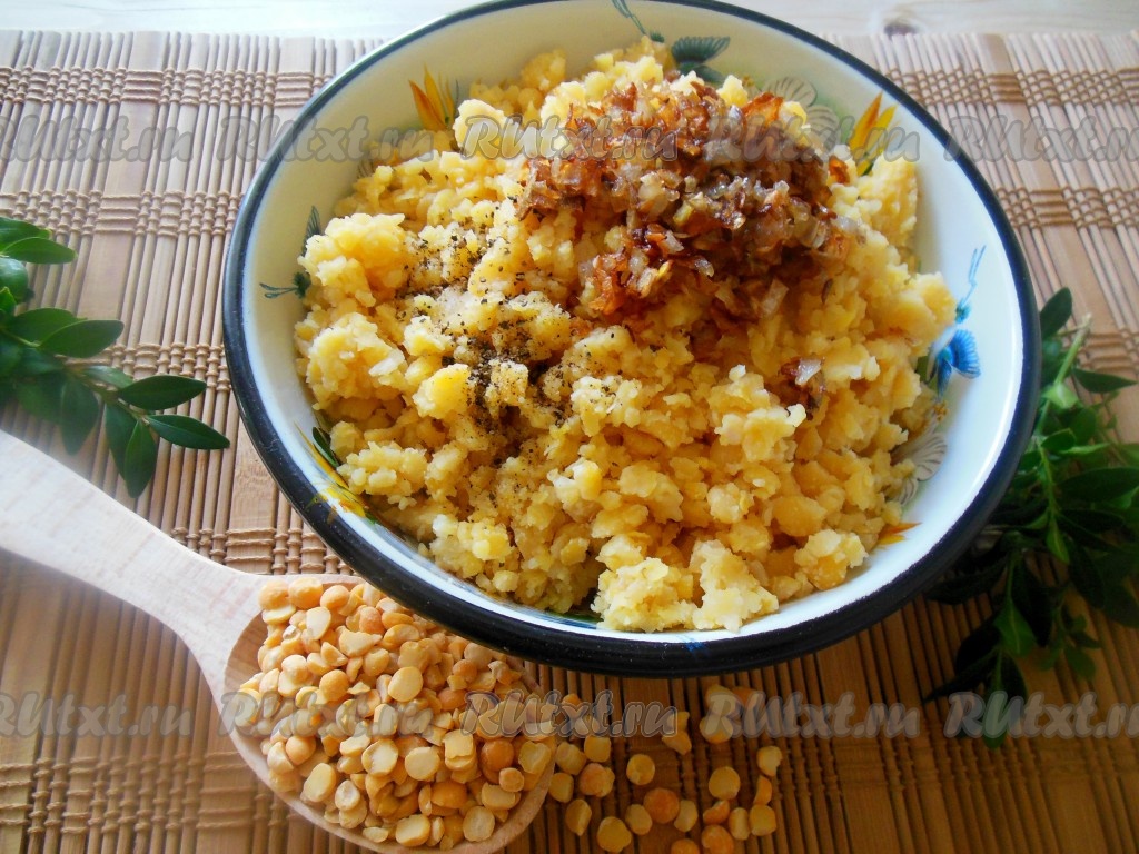 Затем слейте воду, залейте горох 1-1,5 литрами чистой воды, поставьте на огонь и варите после закипания на небольшом огне до готовности (примерно 1-1,5 часа). Время варки зависит от сорта гороха. Готовый горох посолите по вкусу. Репчатый лук измельчите и обжарьте на растительном масле, помешивая, до золотистого цвета. При необходимости протрите гороховое пюре толкушкой, добавьте обжаренный лук, черный молотый перец, хорошо перемешайте. Начинка для пирожков готова.