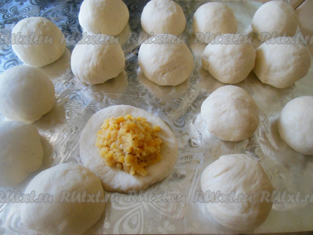 Разделите готовое тесто на равные шарики размером с мандаринку (я разделила на 20 равных частей). Раскатайте каждый шарик теста при помощи скалки, в центр положите 3-4 чайных ложки начинки.