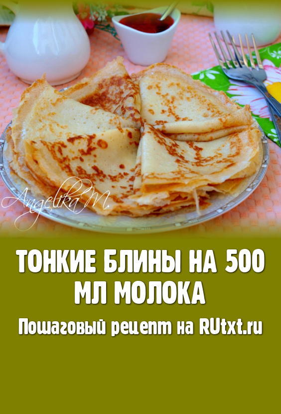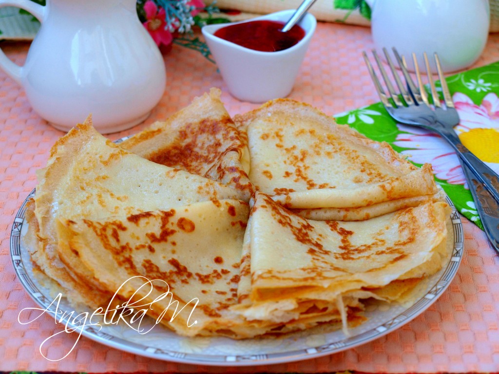 Готовые блинчики подать к столу с мёдом, вареньем или сметаной. Испеките эти тонкие, румяные блины из 500 мл молока, уверена, они обязательно понравятся вам и вашим родным!