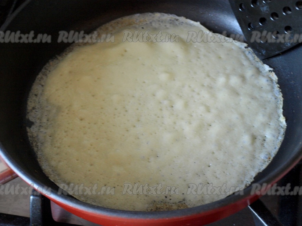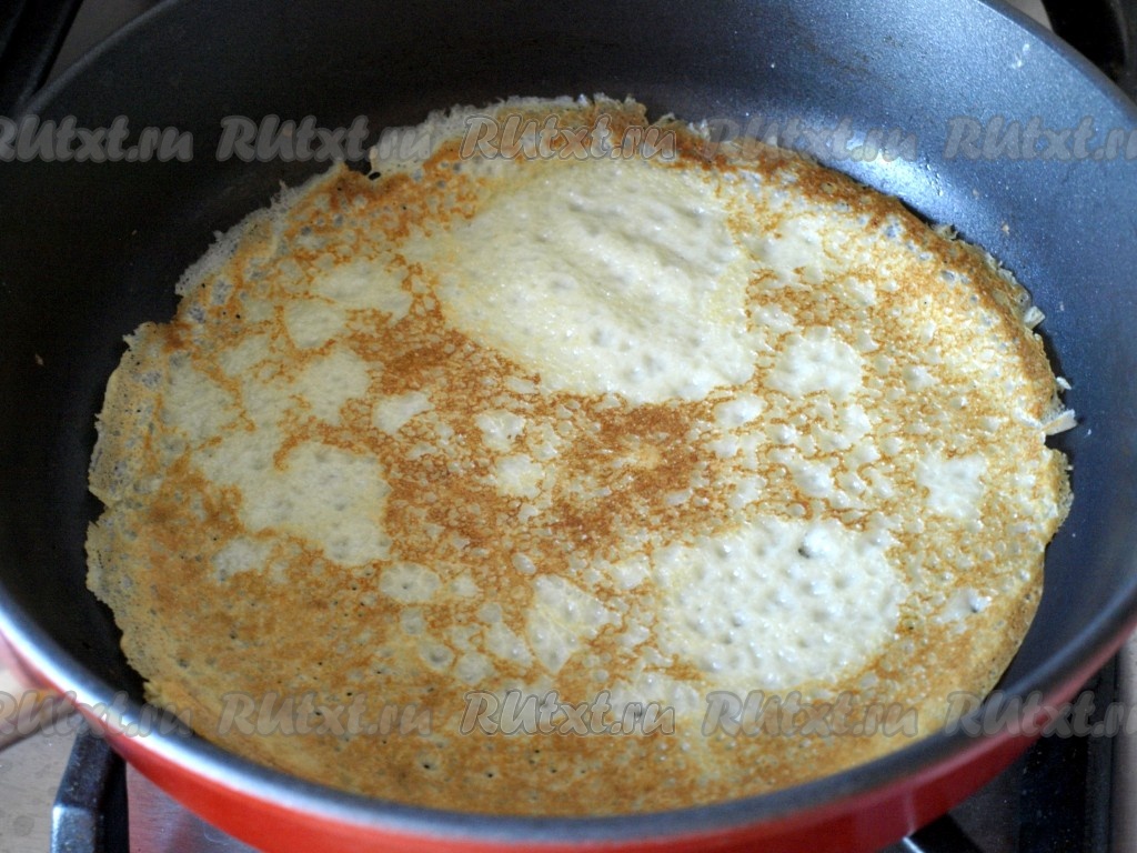 Когда низ блинчика поджарится, перевернуть его на другую сторону и жарить до подрумянивания с другой стороны.