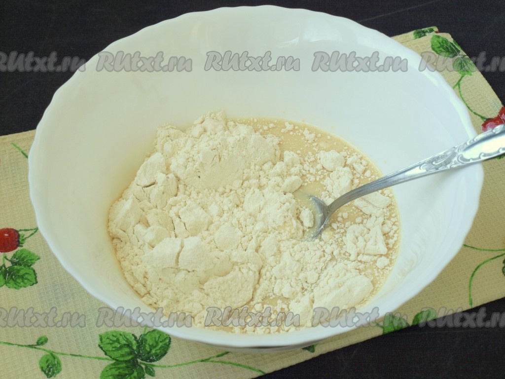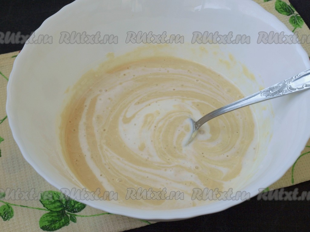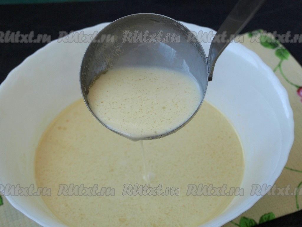 Отмерить 500 миллилитров молока, подогреть до комнатной температуры на плите (или в микроволновке). Добавить в яичную смесь 250 миллилитров молока комнатной температуры, перемешать, всыпать просеянную муку и соду на кончике чайной ложки. Тесто тщательно перемешать столовой ложкой, в нём не должно остаться комочков.