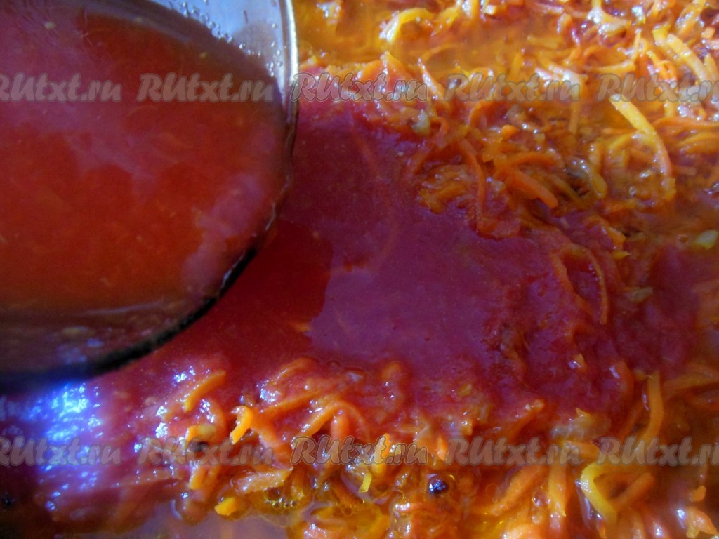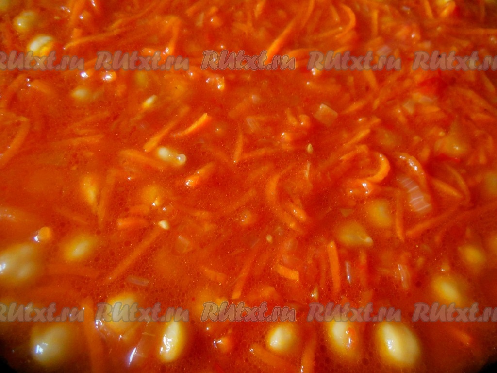 В обжаренные овощи добавьте томатный сок, соль по вкусу и немного сахара.