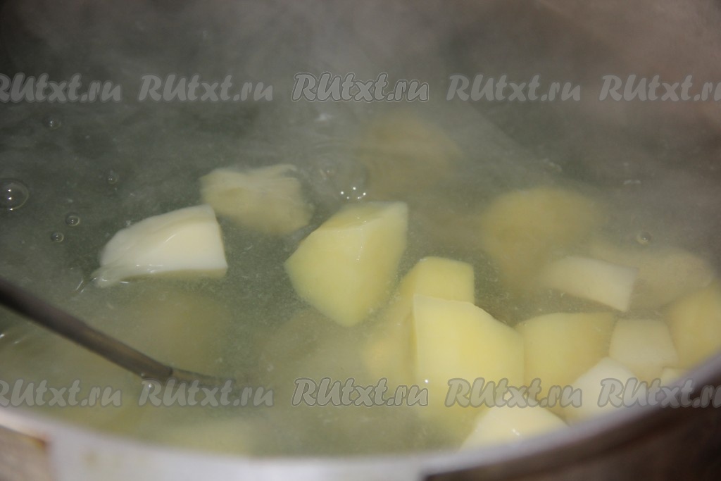 Картофель режем кубиками, заливаем водой и варим до полуготовности.