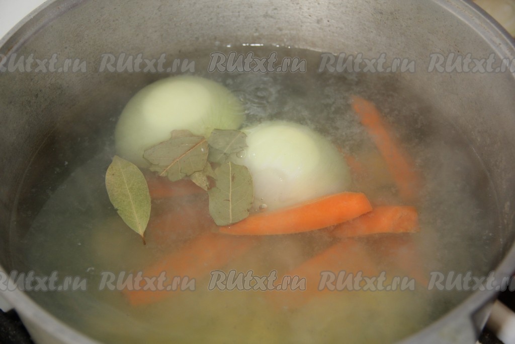 Лук и морковку нарезаем крупными брусочками и отправляем в нашу кипящую воду. Добавляем лавровый лист, перец горошком, соль. Варим до полуготовности.