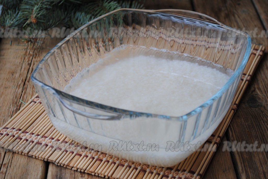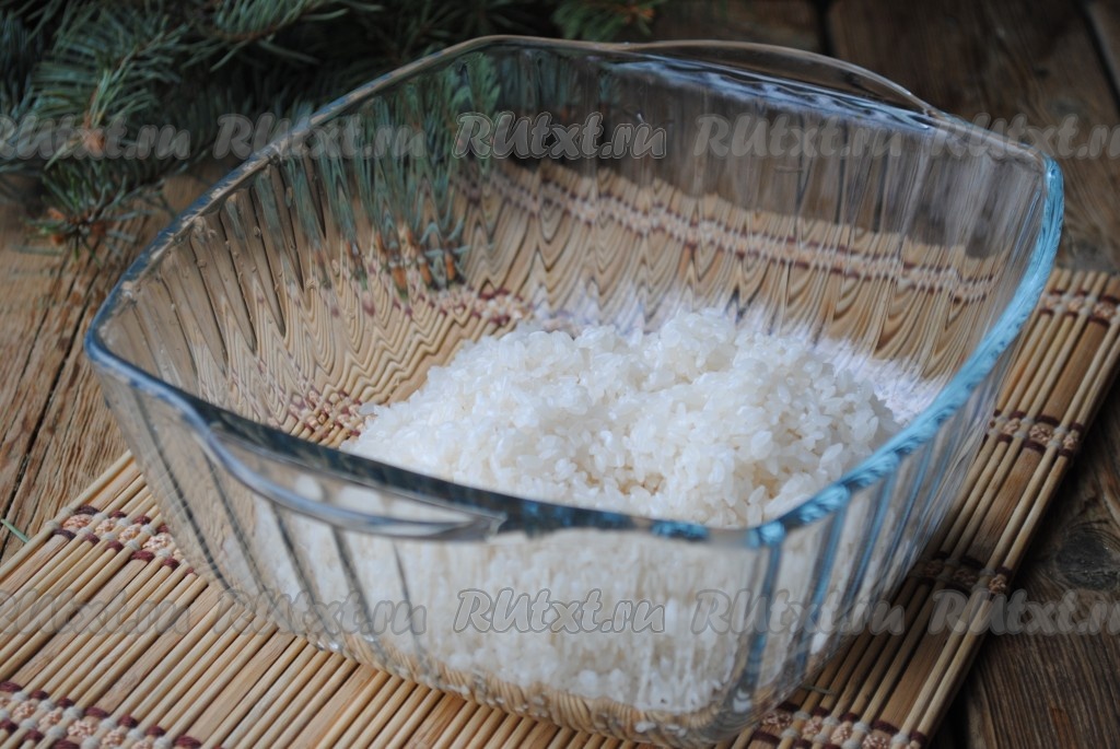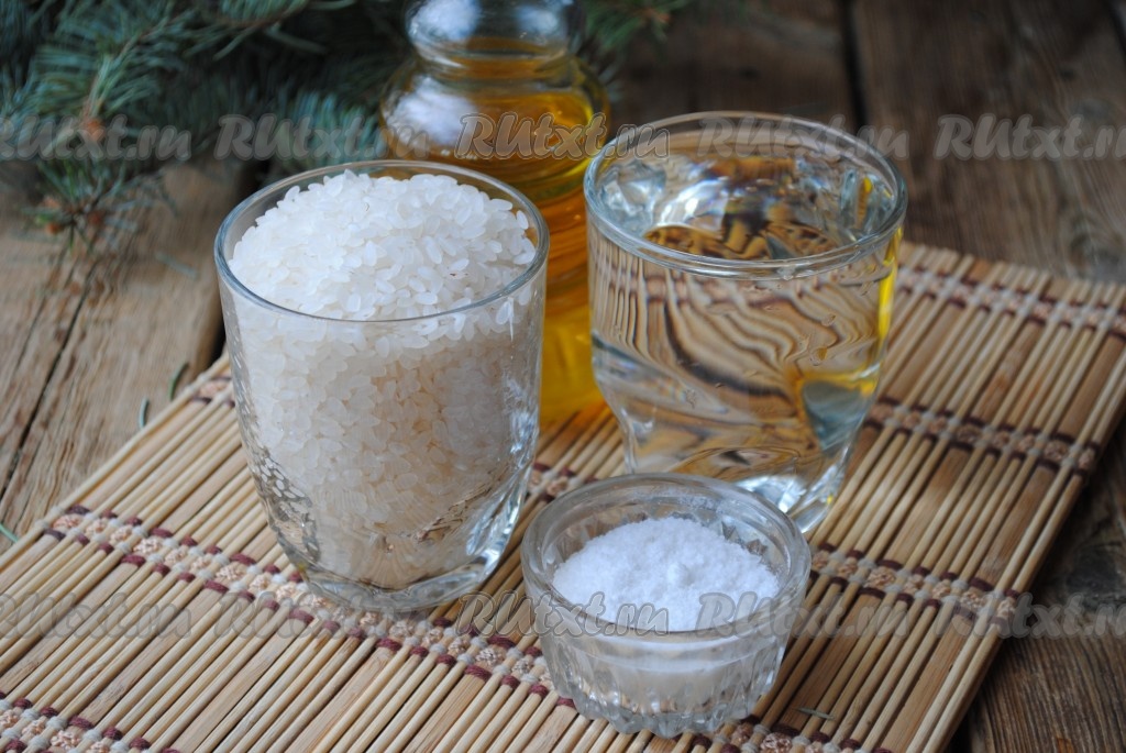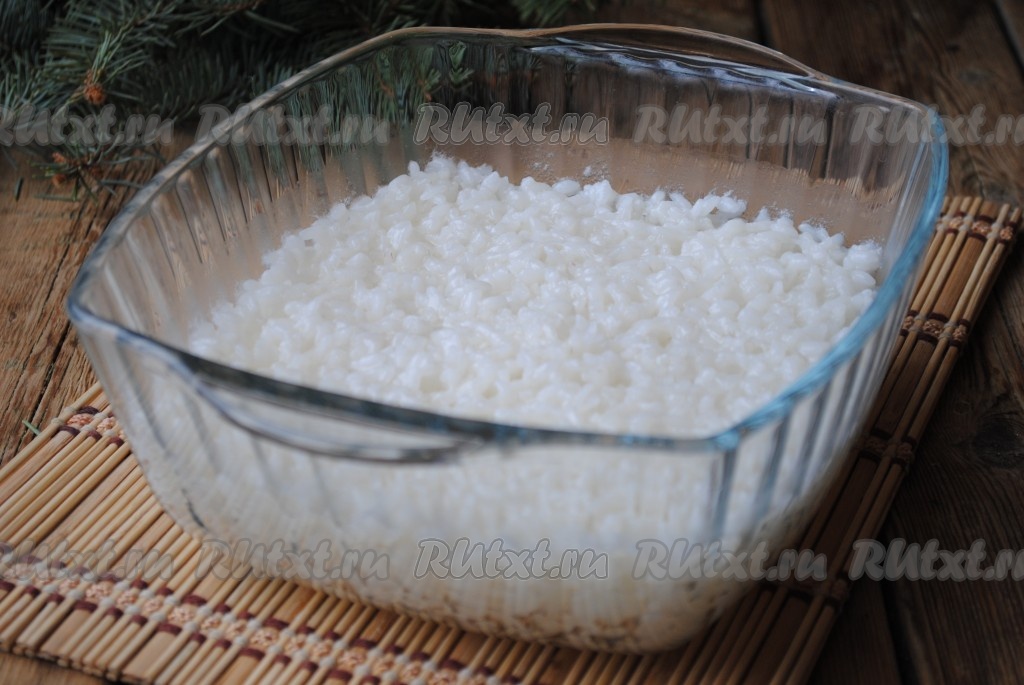 Залить рис 1,5 стаканами чистой холодной воды, добавить растительное масло и отправить в микроволновку при мощности 800 Вт на 15 минут.