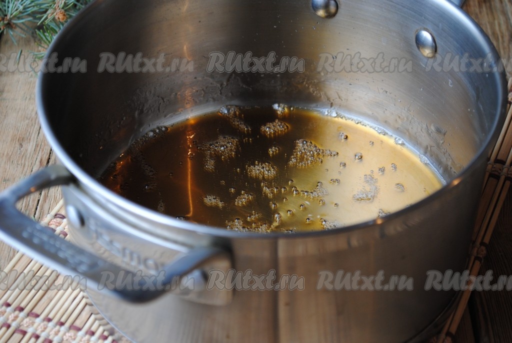 Отправить на плиту и, постоянно помешивая, готовить сироп на медленном огне до светло-коричневого цвета. Я уваривала сироп 7 минут.