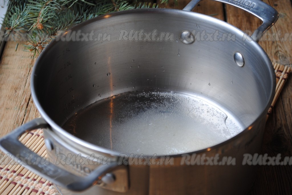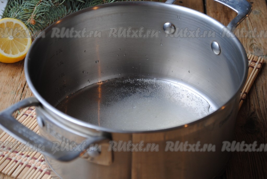 Воду смешать с сахаром и вылить в кастрюлю с толстым дном.