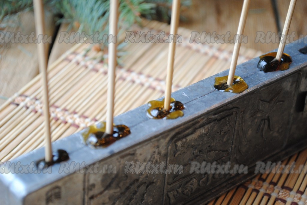 Разлить горячий сироп по углублениям в форме и вставить деревянные палочки.