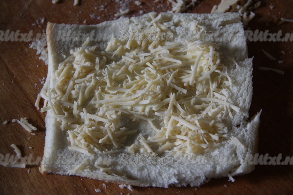На каждый раскатанный кусочек тостового хлеба выложить кусочек сливочного масла и натертый сыр.