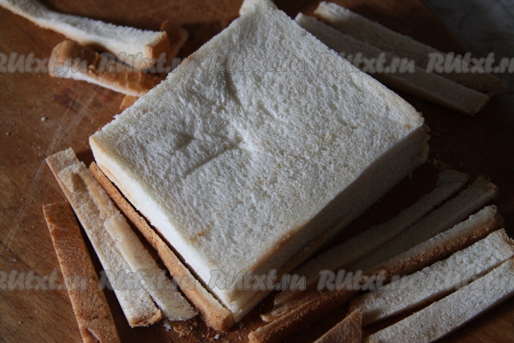Хлеб для тостов сложить стопочкой и отрезать корочку.