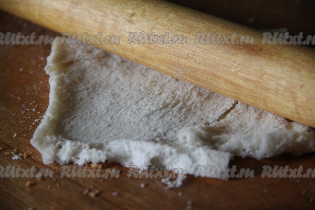 С помощью скалки каждый ломтик хлеба приплюснуть. Скалкой хорошо раскатать хлеб со всех сторон.