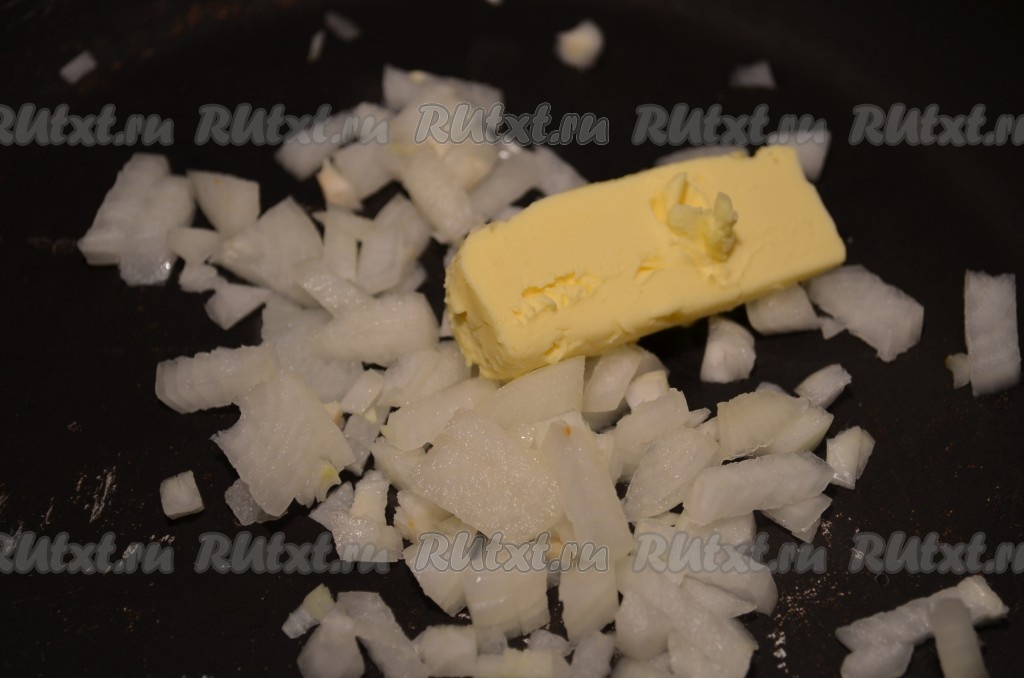 Итак, приступим. Лук мелко порезать, обжарить на сливочном масле. Сливочное масло поможет в дальнейшем сохранить цвет шпината.