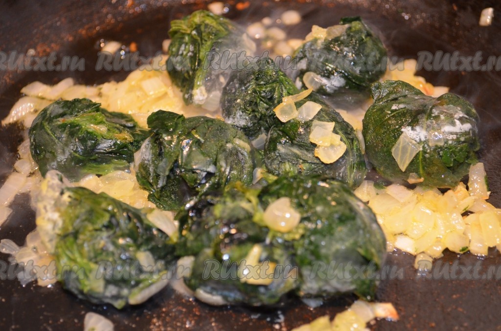 Затем добавить в сковороду замороженный шпинат, потушить.
