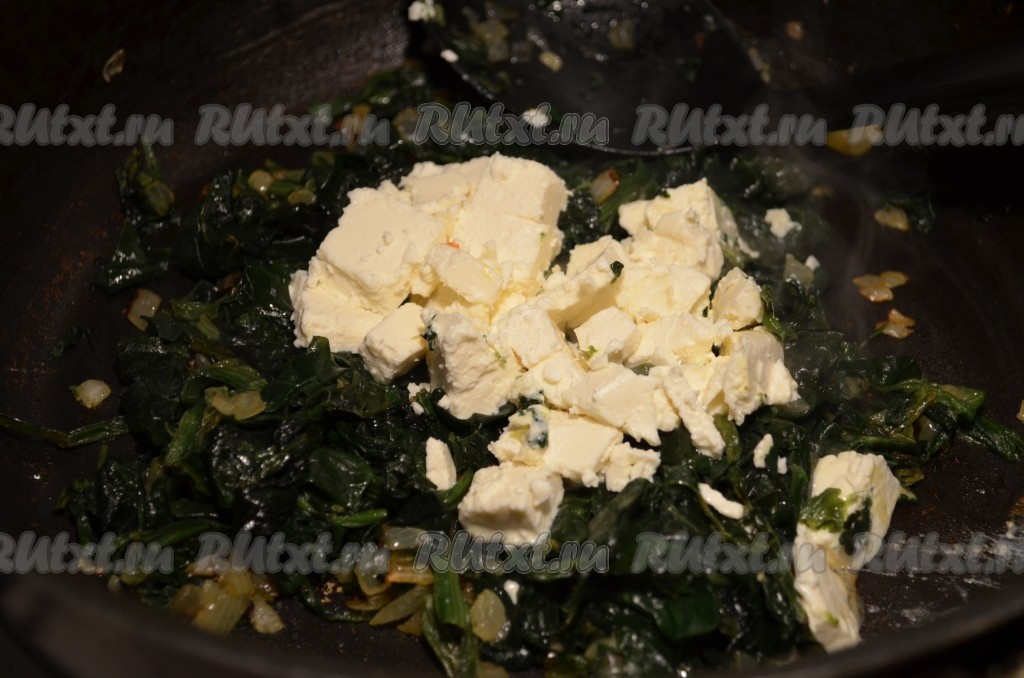 Когда шпинат станет мягким, добавляем мелко порезанный сыр фету. Оставляем на 3-5 минут тушиться, после чего добавляем 100 мл сливок и мускатный орех на кончике ножа.